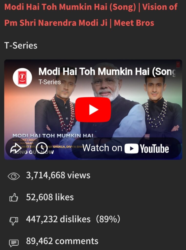 ಪ್ರಧಾನಮಂತ್ರಿ ನರೇಂದ್ರ ಮೋದಿ ಅವರನ್ನು ಪ್ರಶಂಸುವ ಉದ್ದೇಶದಿಂದ ಮೀತ್ ಬ್ರದರ್ಸ್ ಮತ್ತು ಇತರ ಕಲಾವಿದರು ನಿರ್ಮಿಸಿರುವ ಹೊಸ ಹಾಡು ‘ಮೋದಿ ಹೈ ತೋ ಮುಮ್ಕಿನ್ ಹೈ’ ಸೆಪ್ಟೆಂಬರ್ 22, 2025 ರಂದು ಬಿಡುಗಡೆಗೊಂಡಿತ್ತು. ಆದರೆ, ಜನಪ್ರತಿಕ್ರಿಯೆ ಈ ಹಾಡಿನ ಉದ್ದೇಶಕ್ಕೆ ಸಂಪೂರ್ಣ ವಿರುದ್ಧವಾಗಿದೆ.